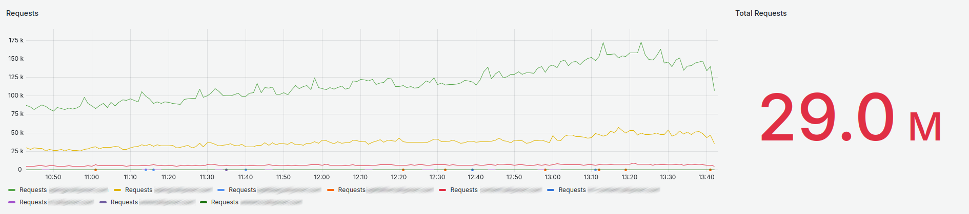 A sudden drop in request volume can indicate temporary log ingestion delay or a filtering mismatch.