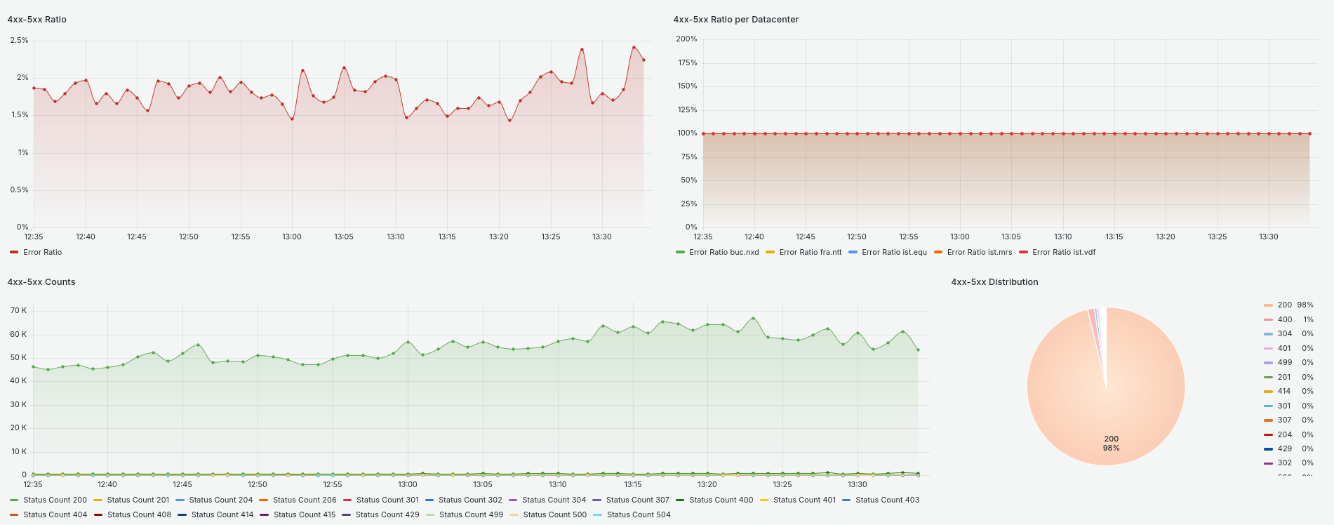 4xx–5xx Ratio per Datacenter (time series): Breaks down errors by PoP.