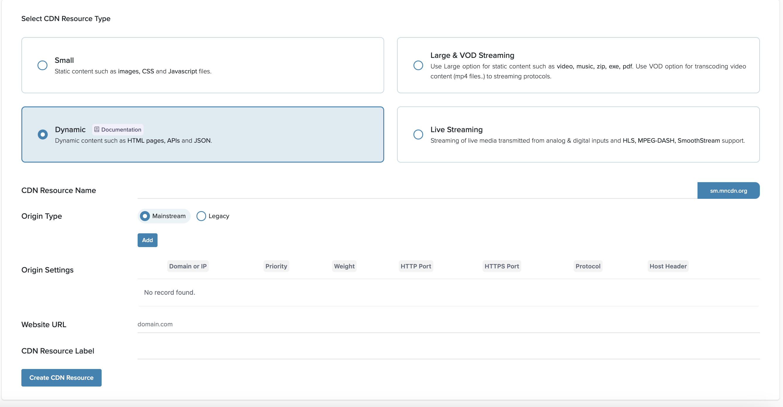 4. Fill in the requested information for Dynamic CDN Resource.