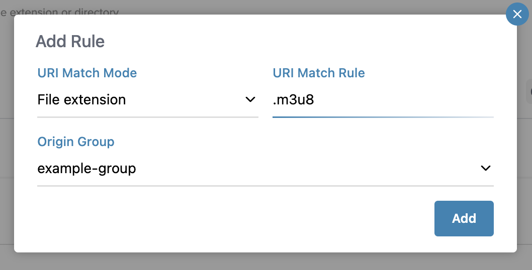 <figure><img src="https://542970813-files.gitbook.io/~/files/v0/b/gitbook-x-prod.appspot.com/o/spaces%2FtK7oIwmhUHdEJcaH4Hx8%2Fuploads%2Fgit-blob-0f87a7149435375226098d0aa4966c07cb03cc34%2Fstreaming-uri-rule-dialog.png?alt=media" alt="" width="563"><figcaption><p>Add Rule dialog – select match mode, enter rule, and assign an origin group</p></figcaption></figure>
