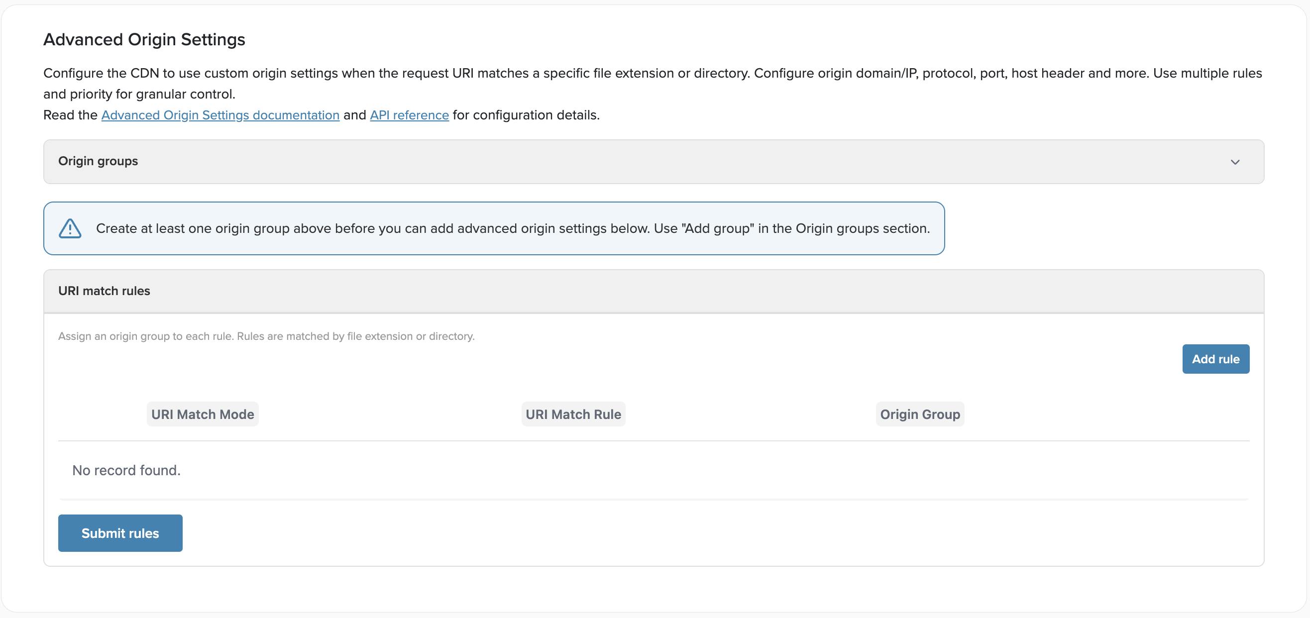 Instead of defining individual origin rules directly, you first create origin groups containing one or more origins, then create URI match rules that route traffic to those groups.