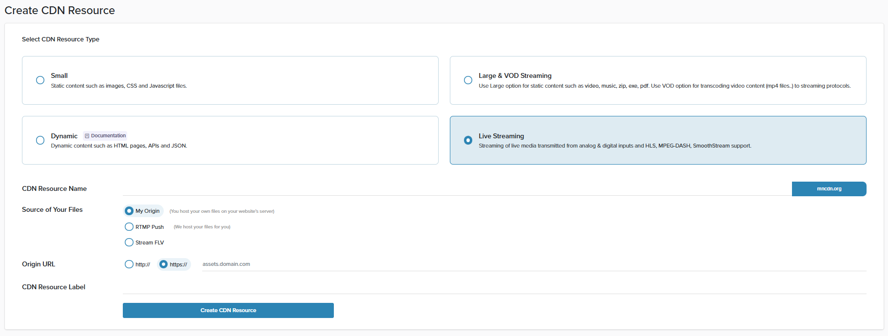 #### Select **Live Streaming** as the CDN Resource type
